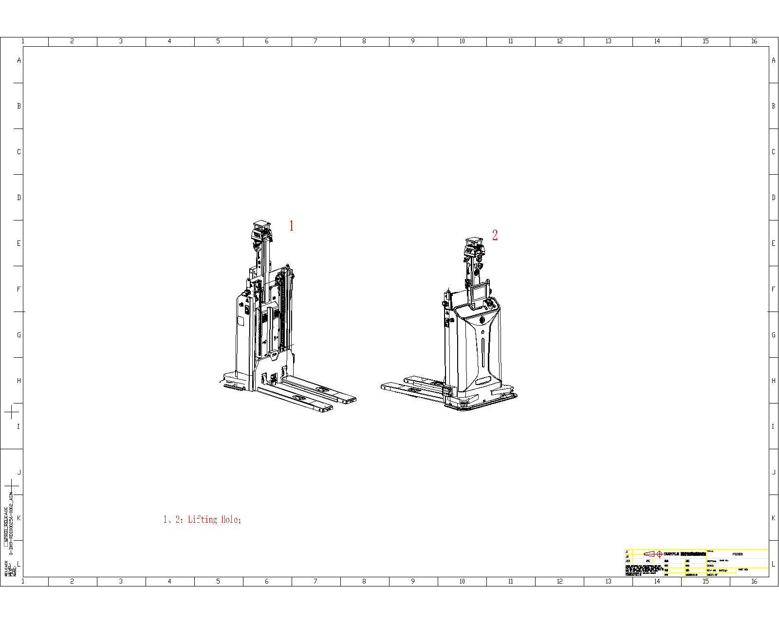 Tải trọng định mức 1500 kg, yêu cầu chiều rộng lối đi lấy hàng 2,2 m.
